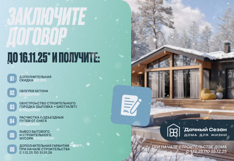 Планируйте строительство заранее и пользуйтесь уникальными бонусами: оформите договор до 16 ноября 2025 года и начинайте строительство с 1 декабря 2025 по 31 января 2026 года с полной поддержкой от нашей компании.