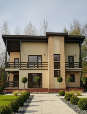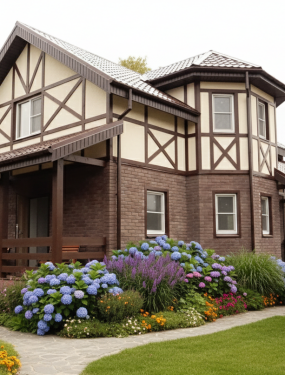 Дом в деревне Авдотьино, Щелковского района был построен по каркасной канадской технологии с утеплением наружного контура в 200мм. В качестве наружной отдекли первого этажа использовались пластиковые фасадные панели Nailite. Второй этаж дома отделан плитами из цементно-стружечной плиты, расшитой декоративной доской в баварском стиле фахверк. Проект дома запроектирован в два полных этажа с максимально рациональной планировкой для данного участка.