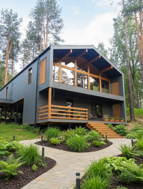 Это двухэтажный дом с просторной, светлой кухонно-гостиной зоной, двумя санузлами, отдельной котельной, тремя спальнями, и двумя гардеробами на первом и втором этажах и рабочим кабинетом. Общая площадь дома 154,4 м2 плюс крытая терраса.