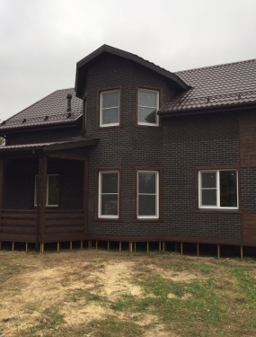 Темный деревянный фасад в сочетании с контрастными деталями придает дому стильный и статусный вид. А просторная терраса стала любимым местом семьи – здесь пьют утренний кофе, устраивают барбекю и просто наслаждаются загородной жизнью.