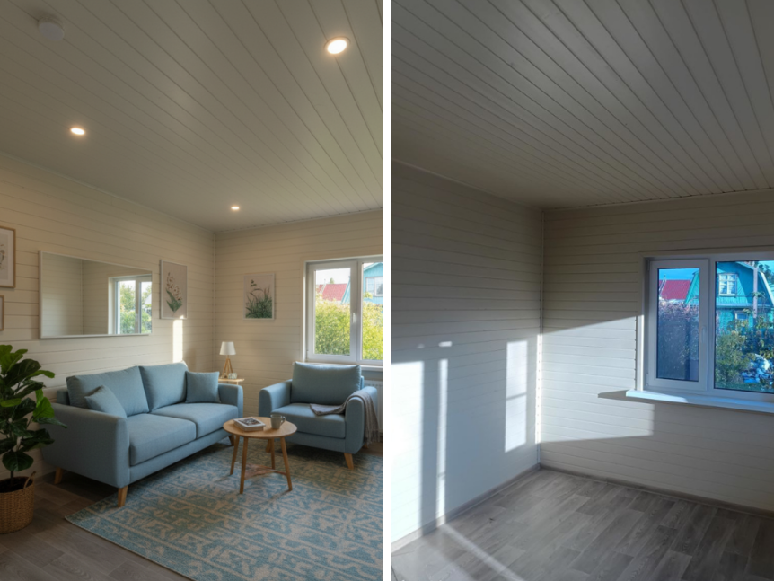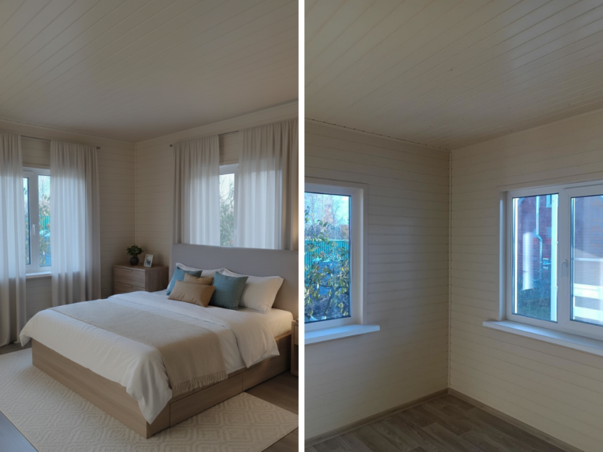 Внутренняя отделка — светлые и тёплые оттенки, LVL-брус, фанера