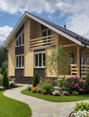 Этот дом гармонично подойдёт как для дачи, так и для круглогодичного проживания — тёплый, практичный и красивый.