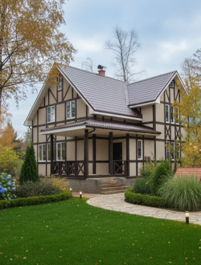 Комфортный семейный дом на 228 м² построен в деревне «Марушкино» (Киевское шоссе) с применением технологии «Каркас» из двутавровых балок. Размеры дома на участке - 11,2*10,2 м. В доме 5 комнат, 2 санузла, большая светлая гостиная с кухней. Верхний этаж – мансардный. Здесь из спальни есть выход на балкон. Большая площадь остекления наполняют жилую часть дома естественным светом, дарит чувство уюта своим владельцам. Сами окна заламинированы под цвет «венге». Внешние стены дома обшиты фасадными панелями, многоуровневая крыша покрыта металлочерепицей.