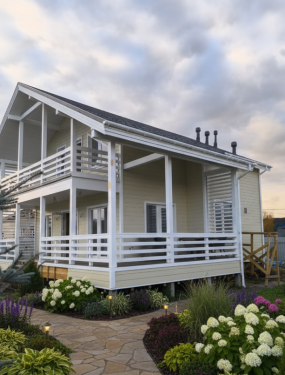 Внутри же мы попадаем в просторную кухню-гостиную с потрясающим масштабным остеклением, из которой можно попасть в одну из 3 спален или 2 санузлов и котельную. А для уютных летних вечеров есть терраса, площадью 10,5 кв.м.