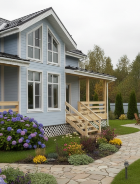 Дом по каркасной технологии построен в Можайском районе, деревня «Захарьино». Линейные размеры - 11,5х10 м. Общая площадь - 110 м². Данный одноэтажный дом рассчитан на постоянное проживание небольшой семьи, а также отлично подходит для дачного варианта. Жилая зона поделена на гостиную с кухней, 2 спальные комнаты, 1 санузел. Для кровельного материала использовали металлочерепицу, были установлены снегозадержатели, проведена система вентиляции помещений с выходом на крышу. Внешние стены дома и цоколь обшиты декоративными панелями. На заднем дворе к дому пристроена небольшая крытая терраса.