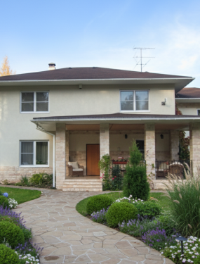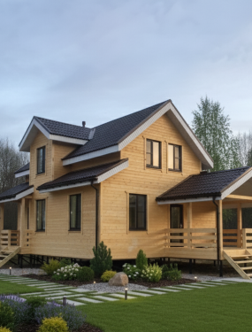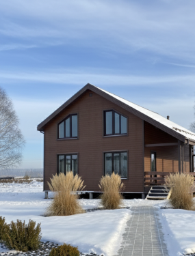 Каркасный дом по проекту «Бристоль» построен в Московской области, Волоколамском районе, деревне Рождествено . Этажность — с мансардой, фундамент — свайно-винтовой. Общая строительная площадь дома составила 130,0 м2, линейные размеры — 10,0×9,0 м. Планировка дома: 4 спальни, 2 санузла, столовая-гостиная, котельная, кабинет, 2 гардеробные комнаты и терраса. Установлены двухкамерные пластиковые стеклопакеты ПВХ Rehau Grazio, ламинированные одностворчатые межкомнатные двери, входная металлическая дверь. Кровля дома — металлочерепица Grand Line Classic с покрытием полиэстер, пластиковая водосточная система.
