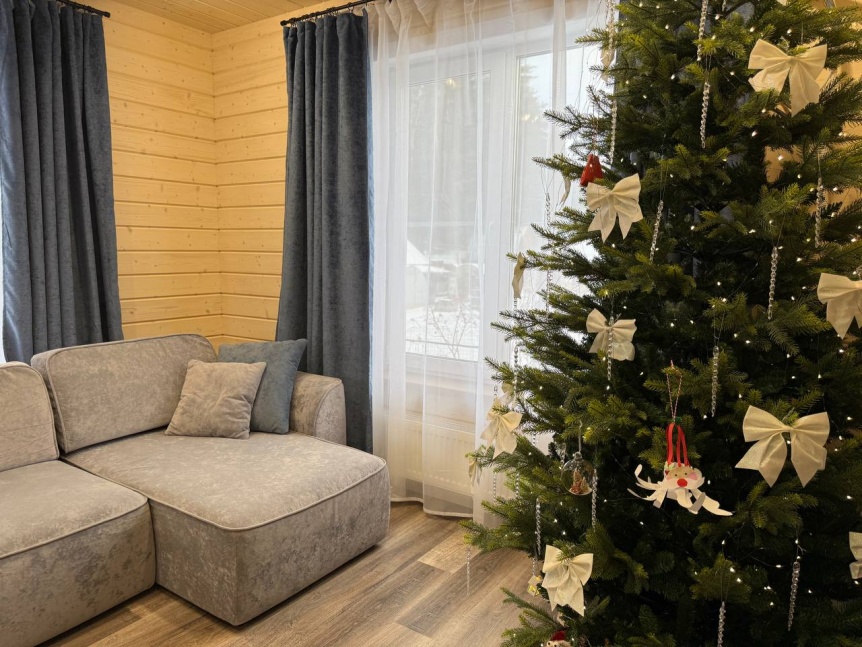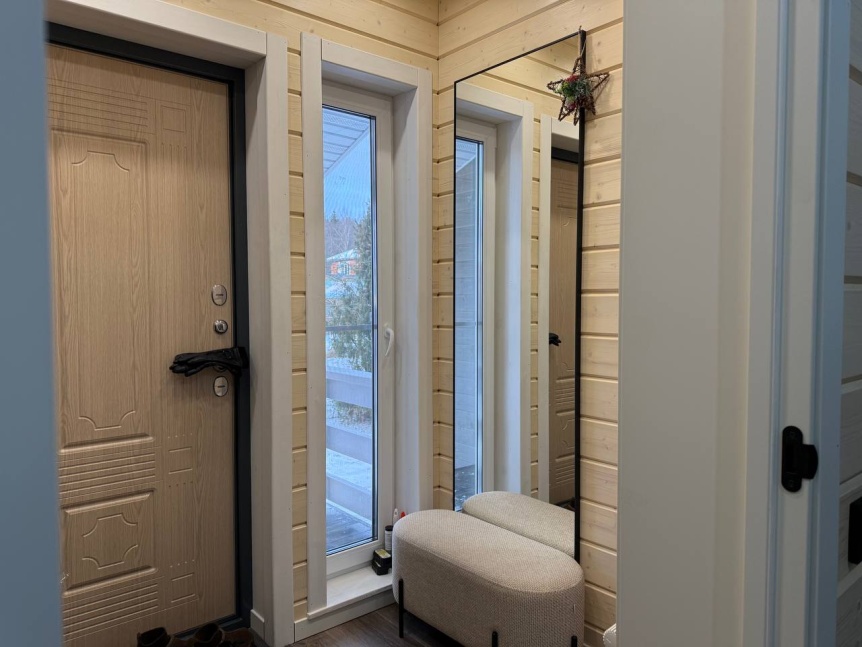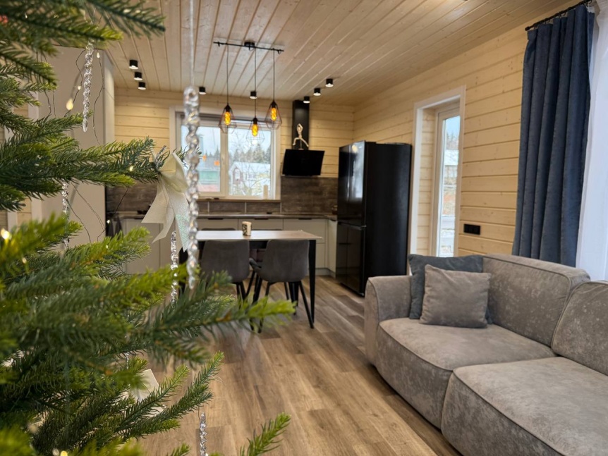 Сердце дома — просторная кухня-гостиная. Здесь легко представить длинные завтраки, шумные ужины и выход на террасу в тёплое время года. Терраса логично продолжает жилое пространство и становится полноценным местом отдыха, а отдельное крыльцо аккуратно отделяет входную зону от частной жизни дома.