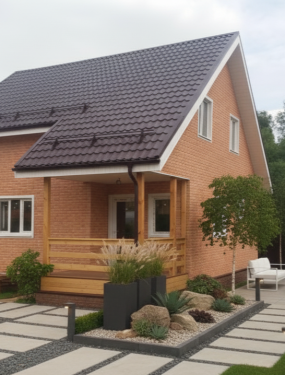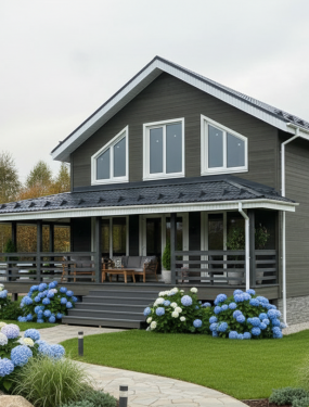 Каркасный дом, построенный в компании "Дачный Сезон". Для придания законченного внешнего вида впервые были использованы фиброцементные панели коричневого цвета. Каркасная конструкция состоит из различных деревянных элементов, где все составляющие находятся на определенном расстоянии относительно друг друга, а образовавшиеся пространство между ними заполняется качественным утеплителем. В данном доме утепляющим материалом является минплита, на основе базальтового волокна.
