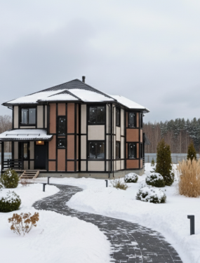 Вашему вниманию предлагается великолепный пример дома из газобетонных блоков. Данный двухэтажный коттедж находится в селе Павловская слобода на Новорижском шоссе. Срок его постройки составил четыре месяца. Строительство велось по индивидуальному проекту на базе ленточного фундамента глубокого заложения. Стены сделаны из хорошо удерживающих тепло газосиликатных блоков. Наружная отделка выполнена при помощи силикатно-силиконовой штукатурки известного бренда «Ceresit». В частности, была выбрана марка штукатурки «СТ 35», обладающая декоративной текстурой типа «Короед» с размером зерна 2,5 мм и 3,5 мм. В качестве кровельного материала была использована мягкая битумная черепица «Tegola», имеющая срок службы более 35 лет.