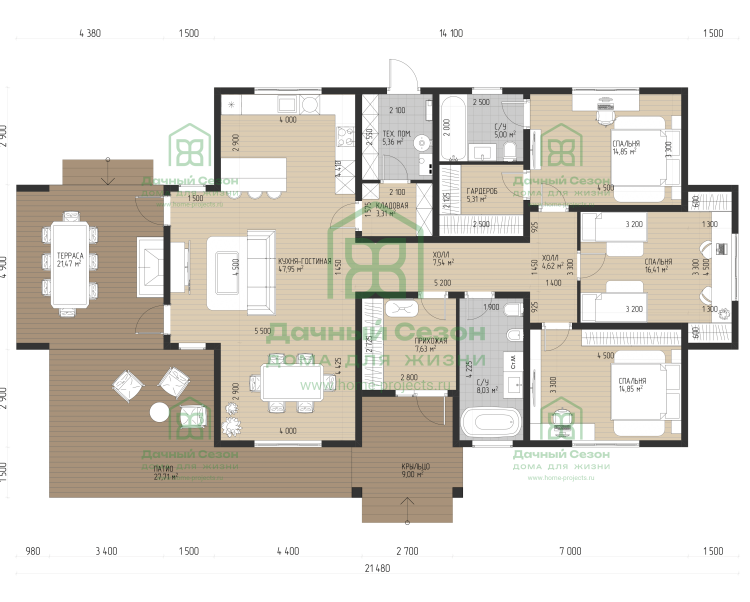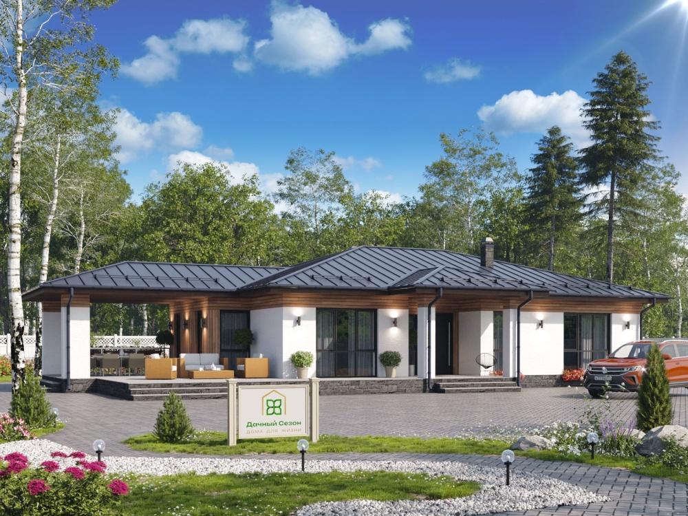 «Арноа» — это современный одноэтажный дом, созданный для комфортной семейной жизни. Просторная кухня-гостиная 48 м² объединяет функциональность и эстетику: здесь удобно готовить, принимать гостей и проводить время всей семьёй. Из гостиной предусмотрен удобный выход на террасу, плавно переходящую в уютное патио — место для отдыха на свежем воздухе.