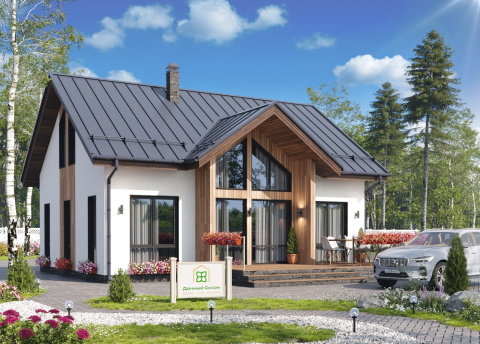 Экстерьер дома построен на эффектном контрасте фактур: белоснежные оштукатуренные стены гармонируют с вертикальным деревянным планкеном теплых оттенков. Массивная двускатная кровля с глубокими свесами не только защищает фасады, но и формирует уютное крытое пространство над террасой. Огромные панорамные окна «в пол» стирают границу между интерьером и ландшафтом, наполняя дом естественным светом.