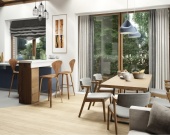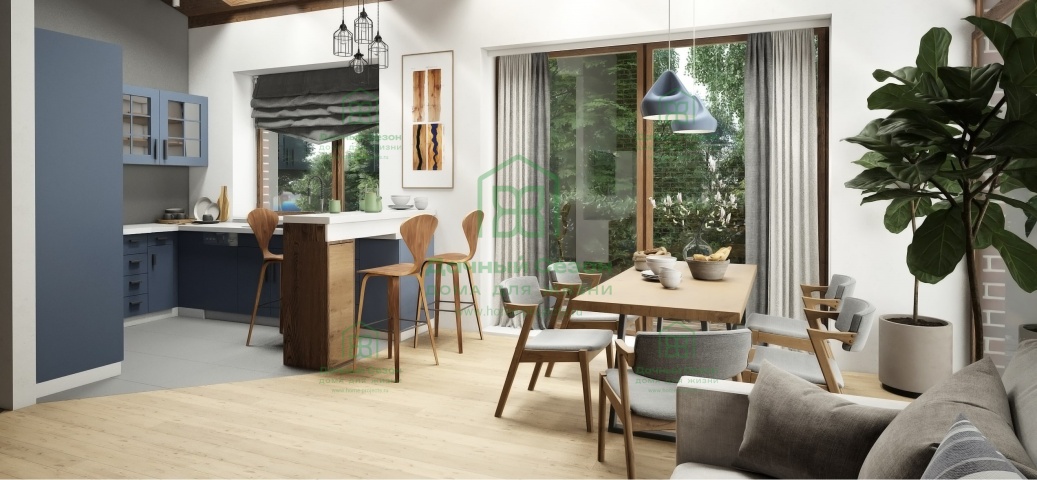 - Просторная кухня-гостиная 30,91 м² с островом, большой обеденной зоной и панорамным остеклением — сердце дома