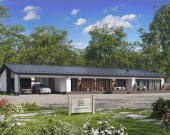 Проект «Ланарк» — это воплощение архитектурного минимализма и функциональности. Одноэтажный дом площадью 245,2 кв.м. (с учетом хозблока) идеально подходит для тех, кто ценит горизонтальную архитектуру, панорамное остекление и четкое зонирование пространства.