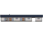 Удлиненный силуэт дома (размеры основного пятна 10,8 х 22,7 м) позволяет гармонично вписать его в просторный участок, создавая приватную атмосферу для жильцов.