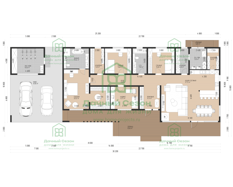 В центральной и левой части дома расположены жилые комнаты, удаленные от шума гостиной: