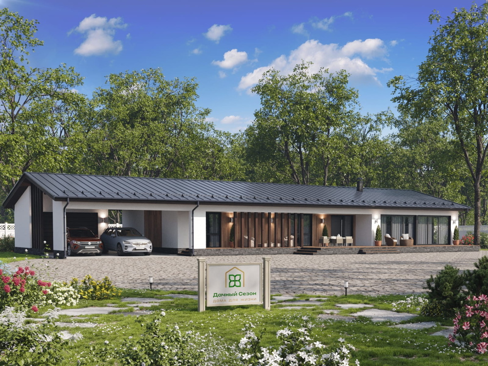 Интегрированный навес: Под единой кровлей с домом расположен просторный навес для двух автомобилей (61,00 кв.м.) и изолированный хозблок (16,56 кв.м.) для хранения садовой техники, велосипедов или сезонного инвентаря.