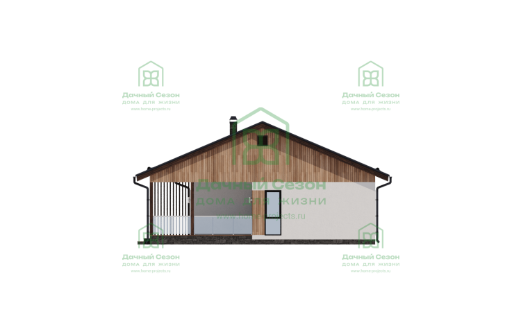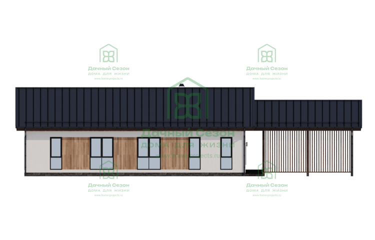 Дом имеет вытянутую форму (основные габариты 9х15 м) и двускатную кровлю из клик-фальца графитового цвета. Фасад комбинированный: светлая штукатурка гармонично сочетается с деревянным планкеном, создавая уютный и современный образ.