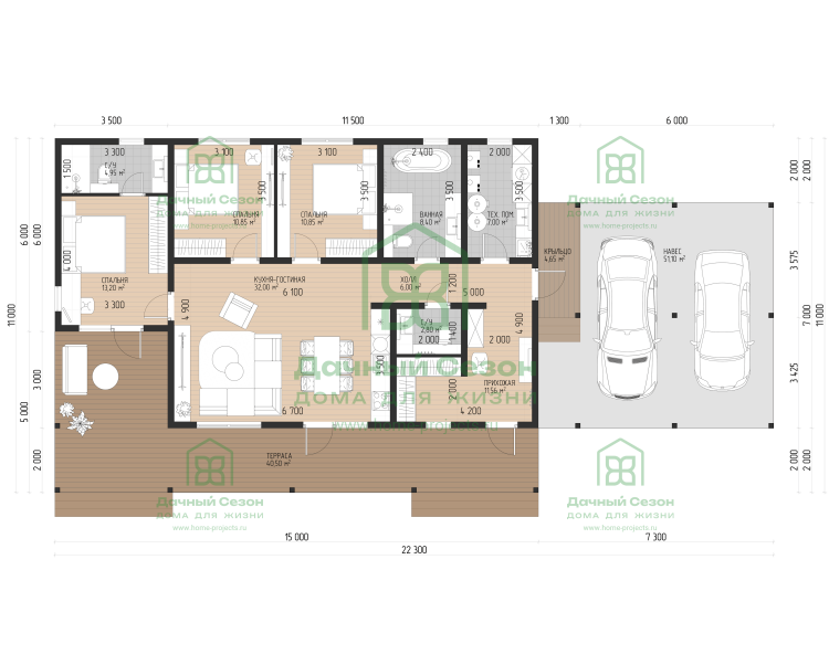 Главная особенность проекта — масштабная терраса площадью 40,5 кв. м, которая фактически опоясывает половину дома. Это идеальное место для летних обедов и отдыха в креслах-коконах. С другой стороны дома расположен функциональный навес для двух автомобилей (51,1 кв. м), интегрированный в общую конструкцию крыши, что избавляет от необходимости строить отдельный гараж.