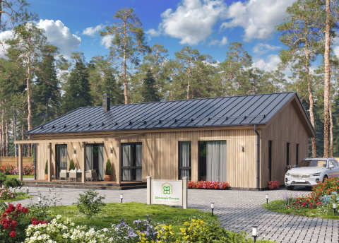 - домокомплект от производителя, который состоит из несущего деревянного бруса, обвязки, ограждающих конструкций стен и теплых панелей, а также деталей кровли.