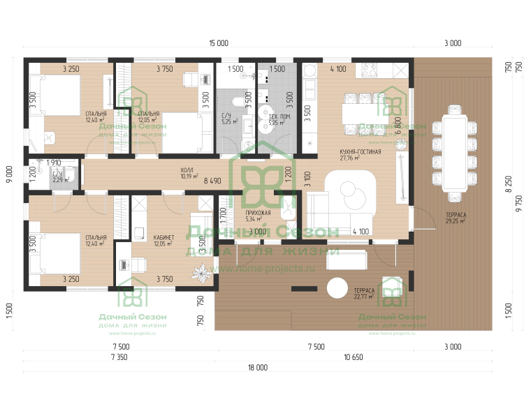 Особое внимание уделено открытым пространствам: дом буквально опоясан террасами. Большая терраса (29,25 кв. м) со стороны кухни-гостиной станет главным местом для летних обедов, а дополнительная терраса (22,77 кв. м) у входа позволяет организовать уютную зону отдыха с креслами и столиком.