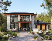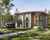 - Представительный фасад в стиле современного минимализма и натуральными материалами: дерево, камень, большие панорамные окна от пола до потолка, кровля с выразительными свесами