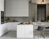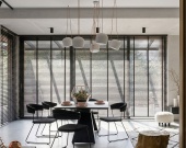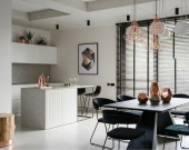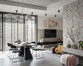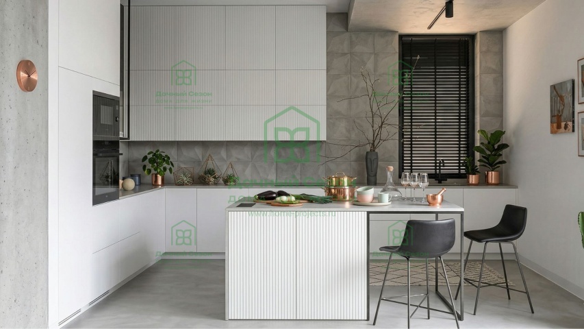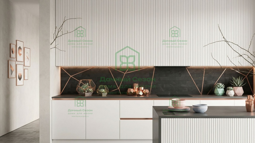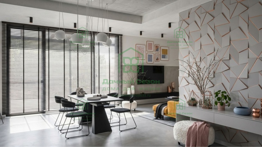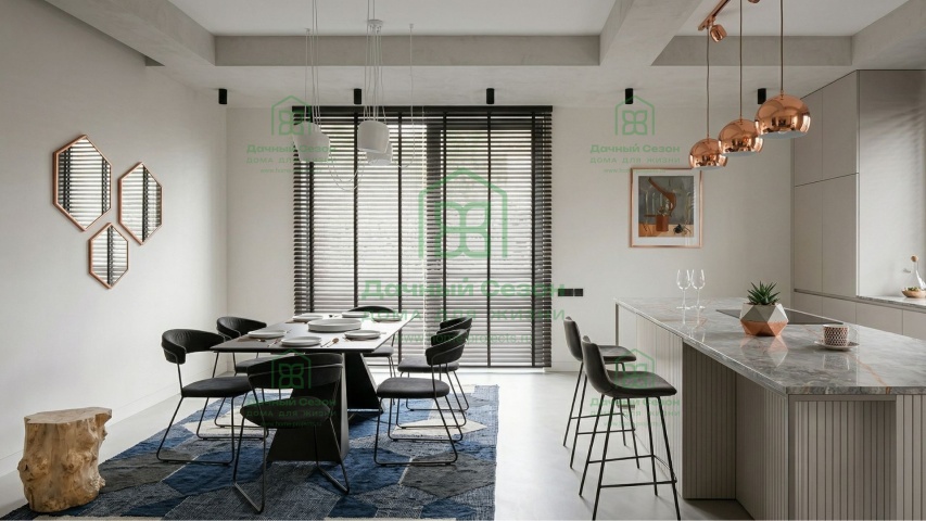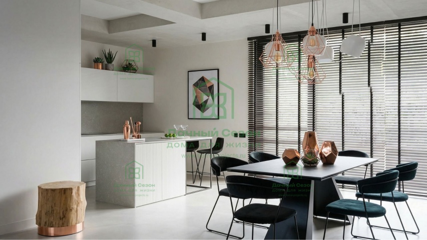 Кухня-гостиная (32 кв. м) — сердце дома. Благодаря панорамным окнам и выходу на террасу, пространство залито светом. Здесь легко разместится большая зона отдыха с угловым диваном и обеденная группа.