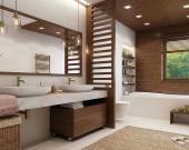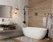 Ванная комната (7,84 кв. м) — по-настоящему просторное помещение, где легко размещается полноразмерная ванна, стиральная машина и системы хранения.