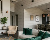 Кухня-гостиная (33,27 кв. м) — сердце дома. Благодаря отсутствию перекрытия над частью гостиной (второй свет), помещение выглядит величественно. Зона кухни выделена в отдельную нишу с окном и удобным «островом».